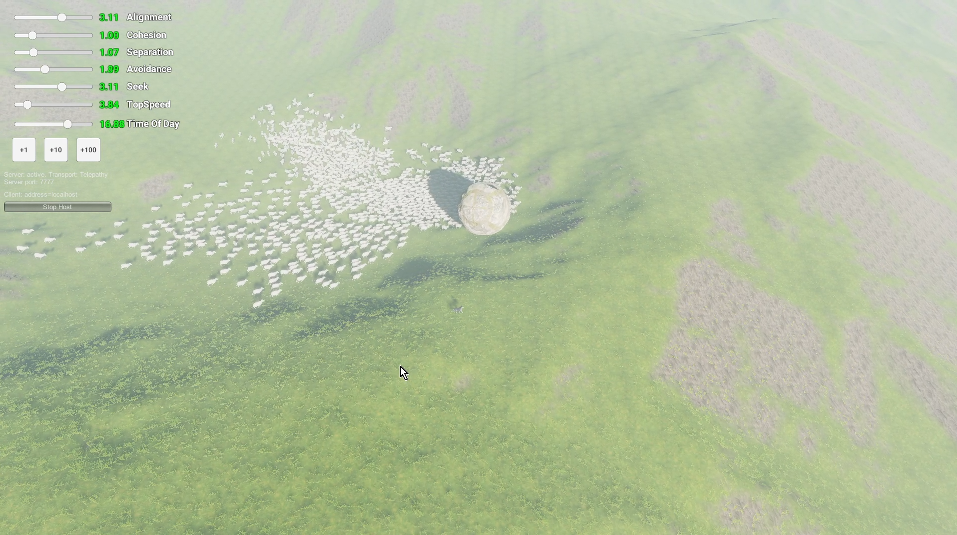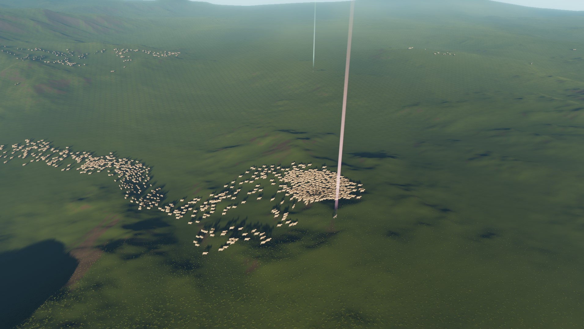 For the past year (off and on) I've been working on a large scale simulation of sheep using Unity. My goal was to get over 1000 concurrent sheep moving over a realistic terrain on a reasonably good PC. While I've had eyes on making this a full game, I want to share what I'm doing before I get to a final decision on that. It's fun to play with even in this early state, and who knows there it will end up. So here we go!